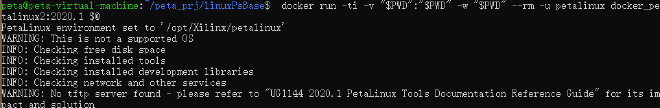 docker run -ti -v "$PWD":"$PWD" -w "$PWD" --rm -u petalinux docker_petalinux2:2020.1 $@