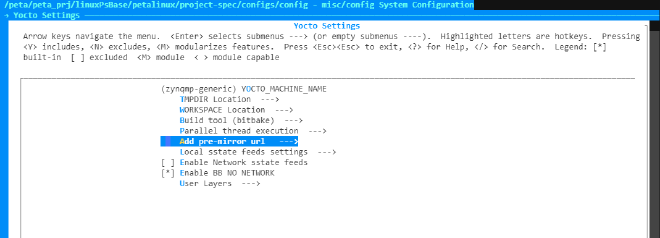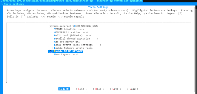 在“Yocto Settings —>”界面中,取消选择“Enable Network sstate feeds”,选择“Enable BB NO NETWORK”选顷, 修改成如下图的状态: