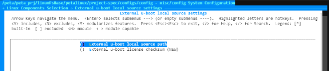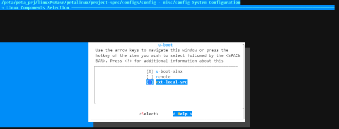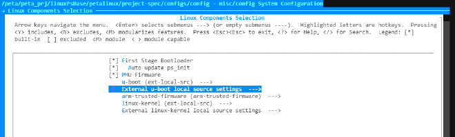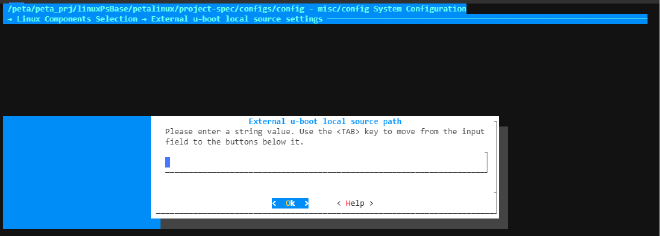 4. 设置u-boot源码的路径,接着上面的步骤选择< Exit >选项回到下图的界面,选择“u-boot (u-boot-xlnx) —>”选项,