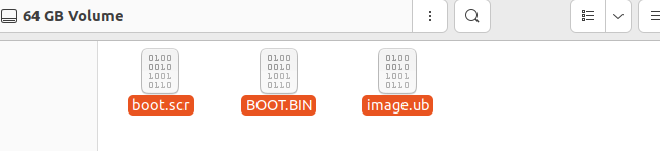 - 将之前得到的BOOT.bin、boot.scr 及image.ub 三个文件拷贝到上一步格式化的SD卡中,然后弹出SD卡。