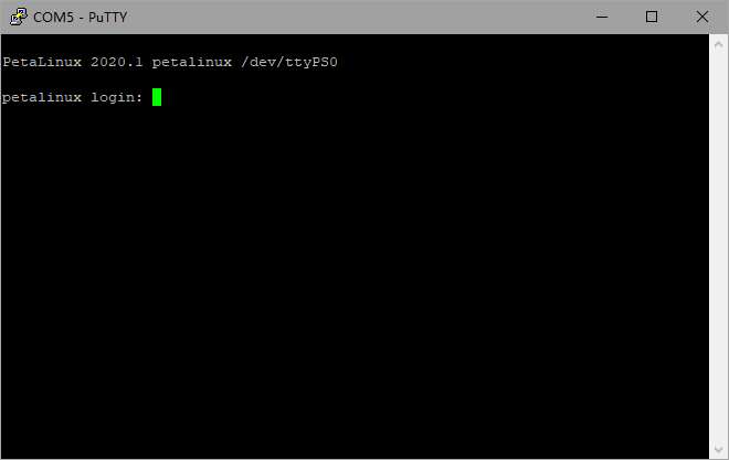 - 在串口工具中输入用户名root,密码root即可登录板载的linux系统(因为petalinux制作的根文件默认为ram类型,所以文件系统不能保存文件和配置即重启后回复初始状态)。