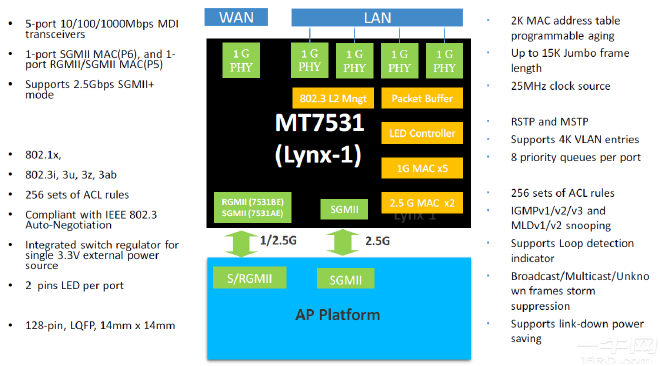 - 1个SGMII MAC(P6),1个RGMII/SGMII MAC(P5)