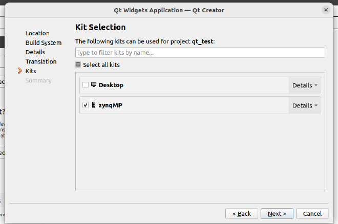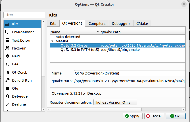 选择前面sdk编译生成的qmake文件,路徂是“/opt/petalinux/2020.1/sysroots/x86_64-petalinux-linux/usr/bin/qmake”。