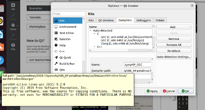 “Name”修改为“zynqMP_GCC”,“Compiler path”选择“/opt/petalinux/2020.1/sysroots/x86_64-petalinux-linux/usr/bin/aarch64-xilinx-linux/aarch64-xilinx-linux-gcc”。