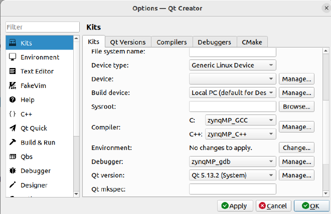 在”Kits”页,点击”Add”添加一个新的”Kit”,”Name”修改为”zynqMP,Device type”选择”Generic Linux Device”,”Compiler C:”选择”zynqMP_GCC”,”Compiler C++”选择”zynqMP_C++”,”Debugger”选择”zynqMP_gdb”,”Qt version”选择”Qt 5.13.2(System)”。
